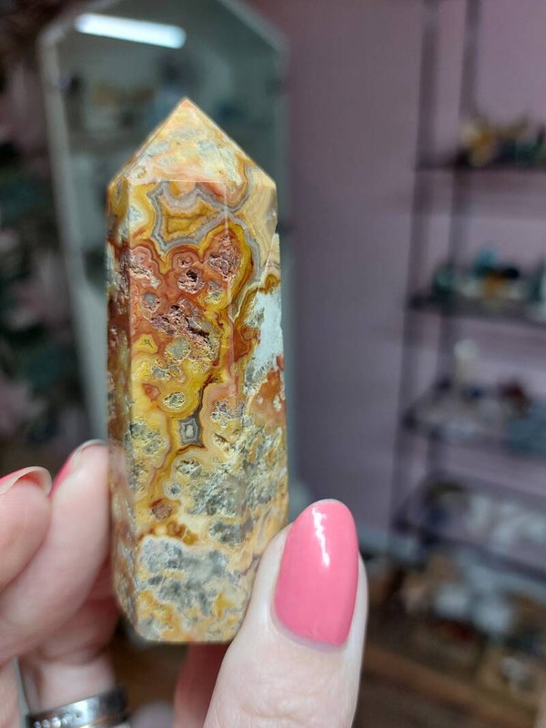 Crazy Lace Agaat leert je hoe je spelend toch hard kunt werken, met een licht hart kunt liefhebben en nieuwsgierig de wereld kunt bekijken. Deze agaat zorgt voor verbinding met je hogere zelven en je creatiekracht. Hij reinigt je fysieke lichaam en zorgt voor een emotioneel en intellectueel evenwicht, werkt kalmerend, maar geeft veel kracht. Een aardende steen die krachtig reinigt en voor fysiek, emotioneel en intellectueel evenwicht zorgt. Hij werkt kalmerend, maar geeft veel kracht, zorgt voor zelfacceptatie en zelfvertrouwen. Emotioneel overwint dit kristal negativisme en verbittering van het hart, geneest innerlijke woede en geeft moed om opnieuw te beginnen. Spiritueel verhoogt hij je bewustzijn en verbindt je met de eenheid van het leven. Goed voor de spijsvertering, het hart, de maag, de ogen en de baarmoeder. Reinigt het lymfestelsel en de alvleesklier, verstevigt de bloedvaten en is goed bij huidaandoeningen.