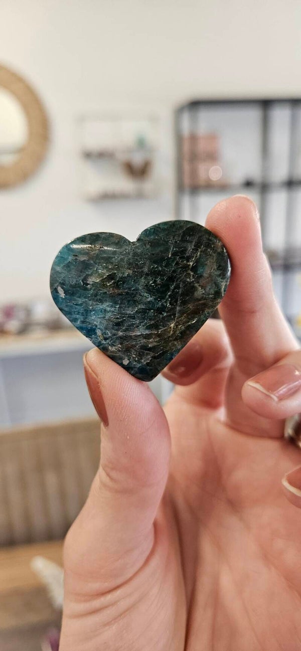 Blauwe Apatiet is een blije steen, hij stimuleert en zuivert het derde oog, zorgt voor inzichten en stimuleert heldere en paranormale vermogens. Het is een steen van spirituele afstemming. Blauwe Apatiet verdiept meditatie, wekt de kundalini op en draagt bij aan communicatie en zelfexpressie op alle niveaus. Onder je kussen stimuleert blauwe Apatiet je visionaire staat en ondersteunt het lucide dromen en astraal reizen. In dromen helpt het je creatieve oplossingen te vinden voor problemen. Apatiet stimuleert creativiteit en het intellect en heft verwarring op. De trilling van dit kristal trekt ‘blauwe wezens’ van andere werelden aan, waardoor je makkelijker contact met hen kan maken. Ook krachtig om te gebruiken bij het terug gaan naar herinneringen uit vorige of paralelle levens omdat de steen toegang geeft tot de Akashakronieken en je eigen zielspatronen. De steen leidt tot openheid en sociale flair en ondersteunt hyperactieve en autistische kinderen. De steen verzacht verdriet en woede, ondersteunt bij het helen van botten en stimuleert de vorming van nieuwe cellen. De steen onderdrukt honger en verhoogt de snelheid van de stofwisseling en moedigt gezond eten aan. Het kristal helpt tevens de bloeddruk te verlagen en is goed voor de klieren. Blauwe Apatiet ondersteunt mensen die hoogtevrees hebben.