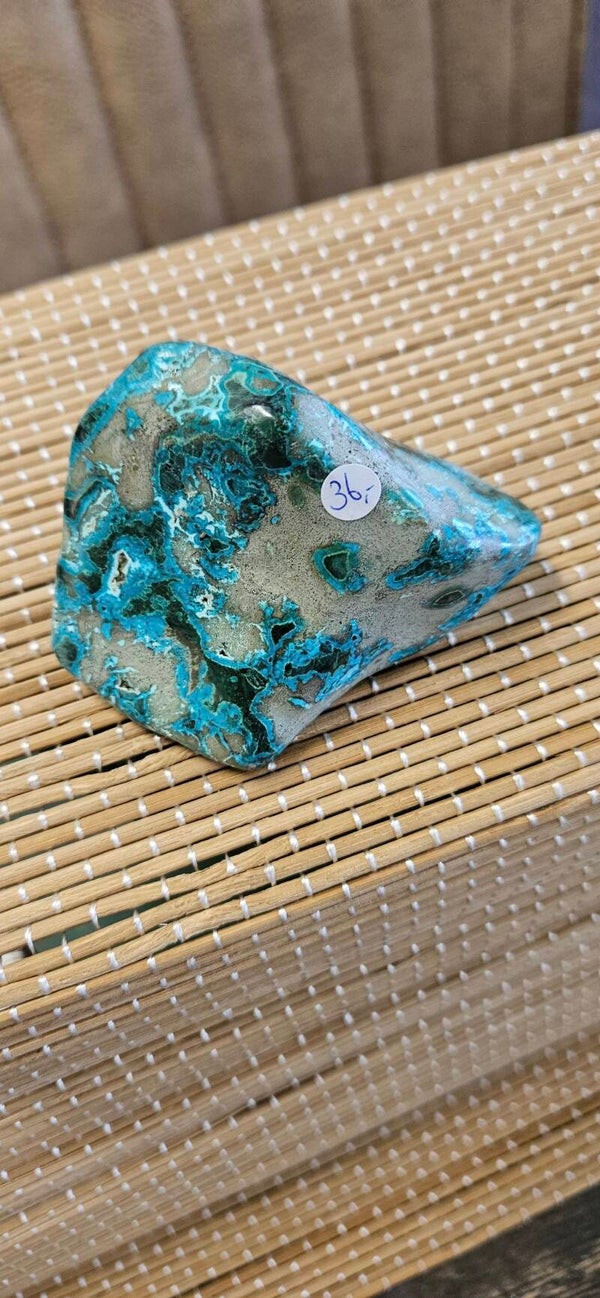 Chrysocolla is een steen die heel oude wijsheden (indianensteen) in zich heeft. Bij meditatie geeft de steen inzicht op allerlei gebied. Bij verdriet of emoties leert deze steen je te uiten en helpt bij de vewerking. Op paranormaal gebied helpt de chrysocolla je om bij jezelf te komen en helpt bij rituelen en regressies. Chrysocolla kalmeert en reinigt alle chakra’s, geeft ze nieuwe energie en brengt ze op één lijn met het goddelijke. Op de zonnevlecht verwijdert het negatieve energieën, zoals schuldgevoel en destructieve emotionele programmeringen. Op het hartchakra geneest het hartzeer en vergroot het het vermogen om lief te hebben. Op de keel verbetert het niet alleen de communicatie maar helpt het u ook in te zien wanneer u dient te zwijgen, op het derde oog gelegd opent het paranormale visie. In huis verwijdert hij allerlei soorten negatieve energiën.