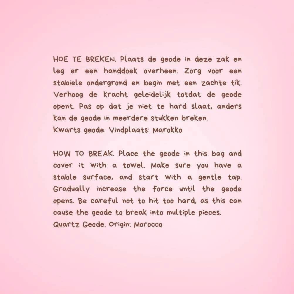 Beleef een spannend doe-het-zelfavontuur: breek je geode open en onthul de prachtige kristallen die er al die tijd in verborgen hebben gezeten. Perfect voor nieuwsgierige kinderen, verzamelaars of gewoon als een unieke toevoeging aan je interieur!