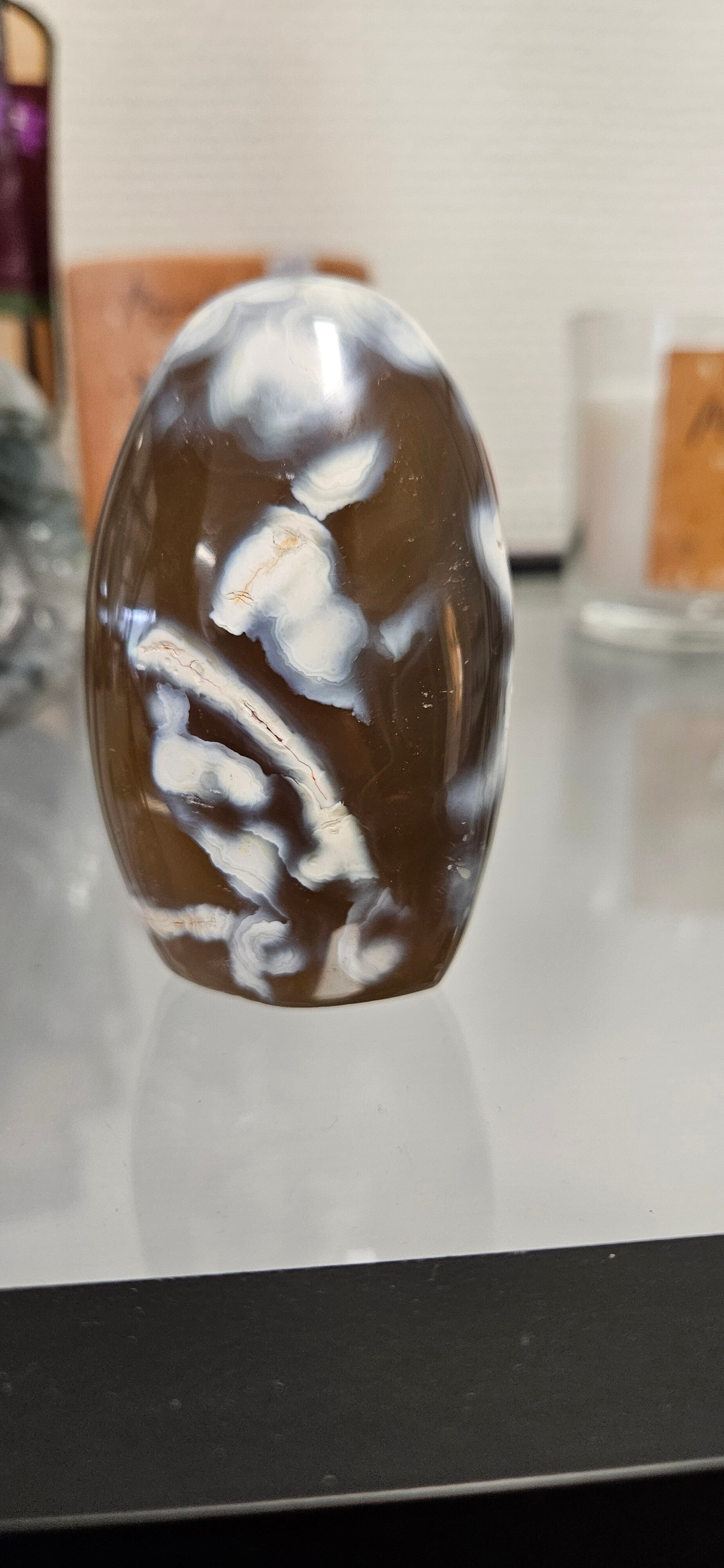 Pinguïn Agaat is een steen die gevonden is in Madagaskar. Het is een aardende steen die krachtig reinigt en voor fysiek, emotioneel en intellectueel evenwicht zorgt. Werkt kalmerend, rustig aan, maar geeft veel kracht. Zorgt voor acceptatie en zelfvertrouwen. Pinguïn Agaat zorgt voor een betere concentratie en moedigt oprechtheid en het spreken van de waarheid aan. Emotioneel overwint dit kristal negativisme en verbittering van het hart. Geneest innerlijke woede en geeft moed om opnieuw te beginnen. Het zwart/wit van de steen symboliseert yin en yang. Dit is een steen van evenwicht die zorgt voor harmonie en balans tussen yin en yang, bewust en onbewust, intellect en intuïtie. Het is de volmaakte steen om het goddelijke vrouwelijke en mannelijke bij elkaar te brengen. Hij vermengt spirituele en aardse vibraties en aardt ze in het lichaam of de omgeving. Pinguïn Agaat biedt blikken in het verleden of de toekomst en zorgt voor een succesvolle afronding van spirituele activiteiten. Spiritueel verhoogt deze Agaat het bewustzijn en verbindt u met de eenheid van het leven. Hij beschermt de aura en transformeert negatieve energie. Pinguïn Agaat stimuleert ook het kruinchakra. Hij harmoniseert de relatie tussen fysieke en fijnstoffelijke lichamen. Her-programmeert ingesleten gedragspatronen in de etherische blauwdrukken en zorgt voor diepgaande verandering. Tevens helpt deze Agaat negatieve ervaringen te verwerken en zet ze om in positieve lessen. De steen geeft troost bij panieksituaties, verdriet, of na een verlies, bijvoorbeeld het overlijden van een dierbare.