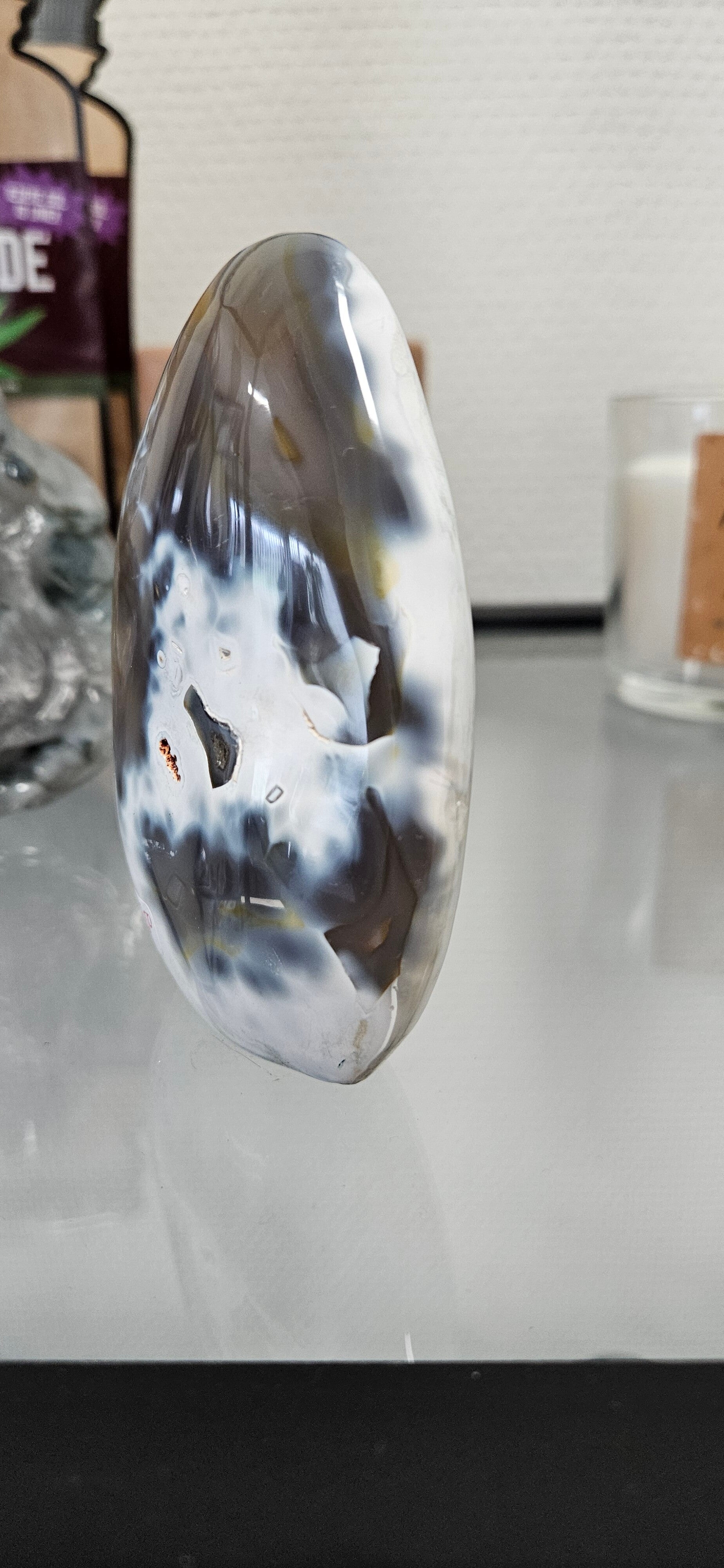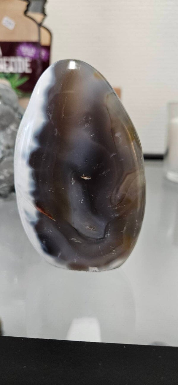 Pinguïn Agaat is een steen die gevonden is in Madagaskar. Het is een aardende steen die krachtig reinigt en voor fysiek, emotioneel en intellectueel evenwicht zorgt. Werkt kalmerend, rustig aan, maar geeft veel kracht. Zorgt voor acceptatie en zelfvertrouwen. Pinguïn Agaat zorgt voor een betere concentratie en moedigt oprechtheid en het spreken van de waarheid aan. Emotioneel overwint dit kristal negativisme en verbittering van het hart. Geneest innerlijke woede en geeft moed om opnieuw te beginnen. Het zwart/wit van de steen symboliseert yin en yang. Dit is een steen van evenwicht die zorgt voor harmonie en balans tussen yin en yang, bewust en onbewust, intellect en intuïtie. Het is de volmaakte steen om het goddelijke vrouwelijke en mannelijke bij elkaar te brengen. Hij vermengt spirituele en aardse vibraties en aardt ze in het lichaam of de omgeving. Pinguïn Agaat biedt blikken in het verleden of de toekomst en zorgt voor een succesvolle afronding van spirituele activiteiten. Spiritueel verhoogt deze Agaat het bewustzijn en verbindt u met de eenheid van het leven. Hij beschermt de aura en transformeert negatieve energie. Pinguïn Agaat stimuleert ook het kruinchakra. Hij harmoniseert de relatie tussen fysieke en fijnstoffelijke lichamen. Her-programmeert ingesleten gedragspatronen in de etherische blauwdrukken en zorgt voor diepgaande verandering. Tevens helpt deze Agaat negatieve ervaringen te verwerken en zet ze om in positieve lessen. De steen geeft troost bij panieksituaties, verdriet, of na een verlies, bijvoorbeeld het overlijden van een dierbare.