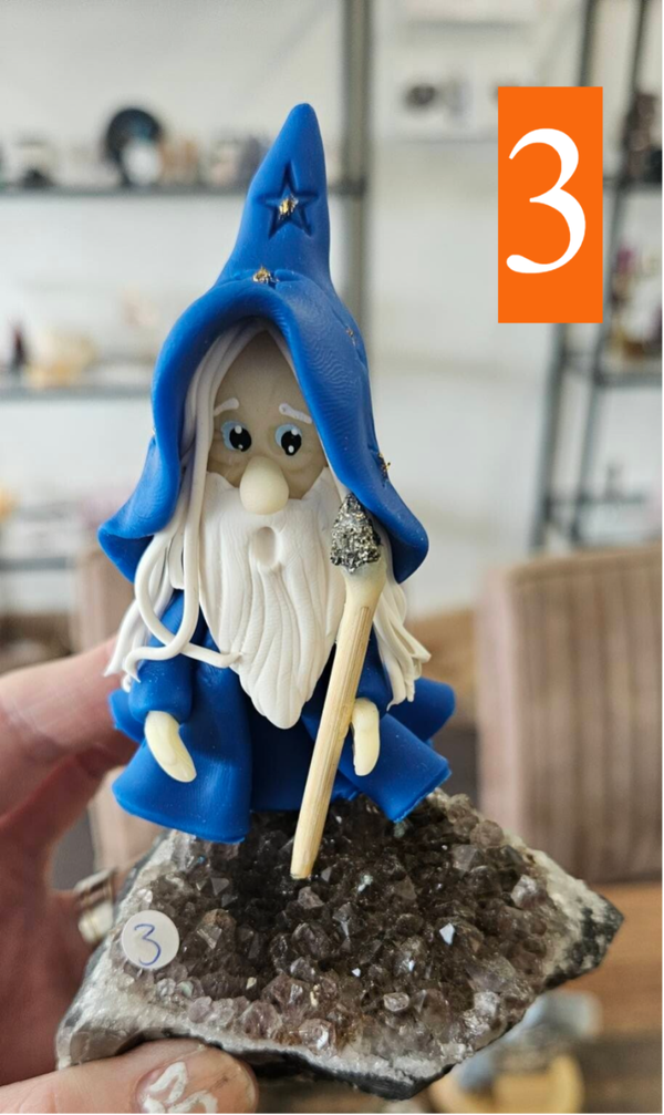 Deze prachtige handgemaakte heksjes en tovenaars staan op een schitterende Amethist en zijn stuk voor stuk uniek. Geen één is hetzelfde – ieder figuurtje heeft zijn eigen uitstraling, energie en karakter.